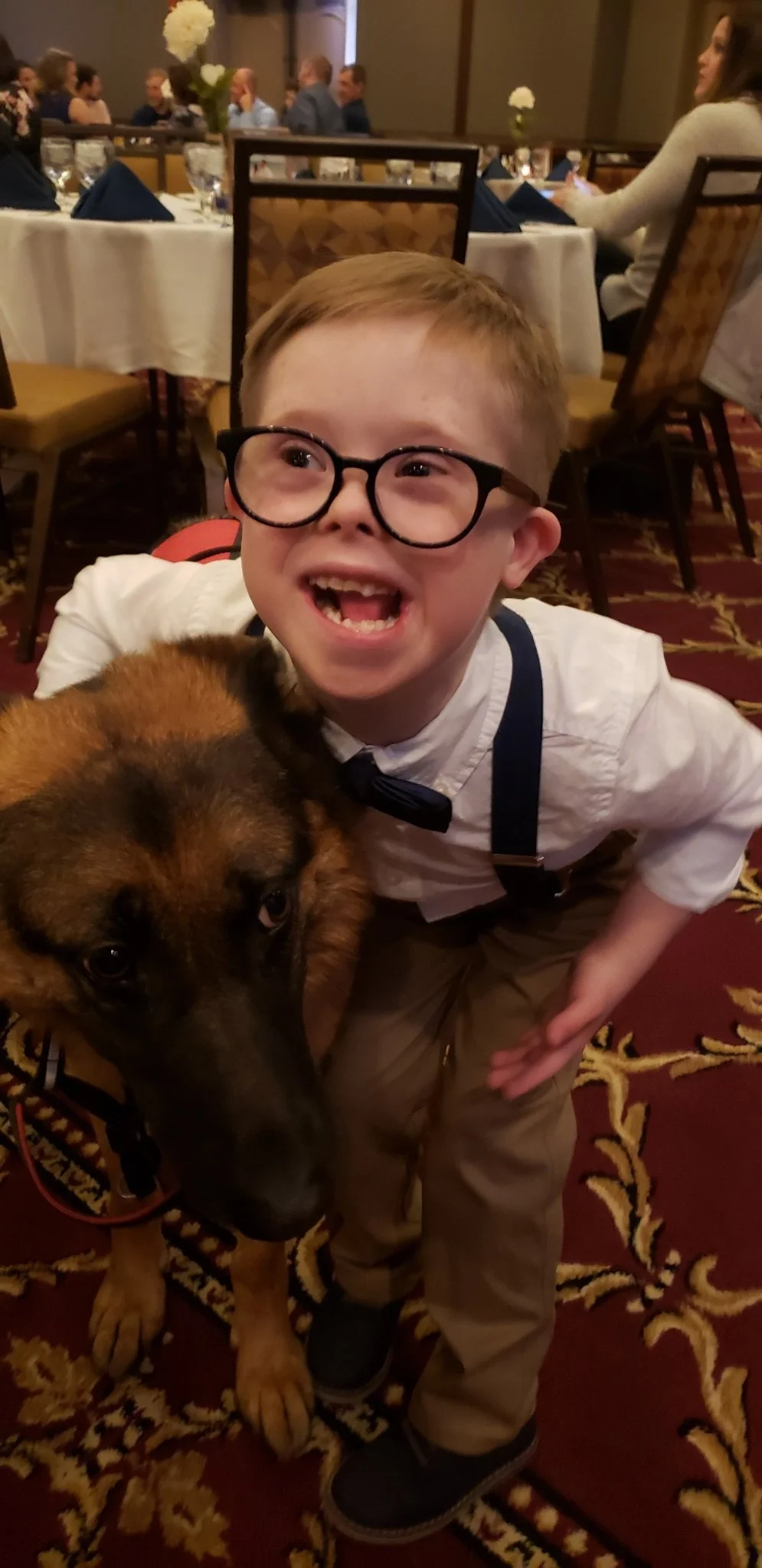 Tasks Sunny does for Charlie like deep pressure therapy, block, traction forward walking, or redirecting self harm. She has also given him confidence, pride, and independence. We have been able to do so much more together as a family than we ever could have imagined. We are all so grateful for Sunny.